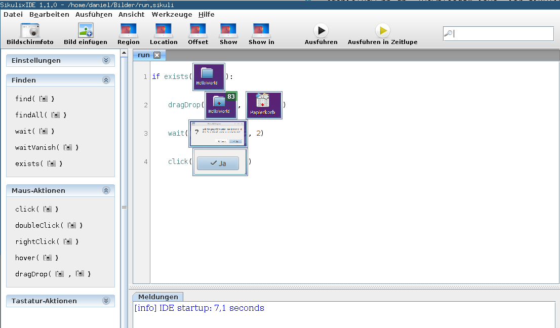 The program in the image on top, for example, will search for a directory called "HelloWorld" using image recognition. If a match is found, it will drag the directory to the recycle bin and wait a short time for the confirmation message to appear. When it does, it will confirm the deletion of that directory.