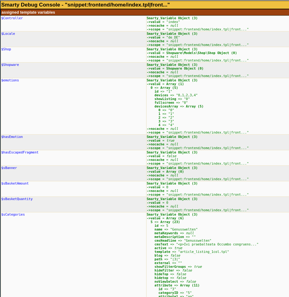 In this example, the {debug} tag was put in the themes/Frontend/Bare/frontend/index/index.tpl file, inside the frontend_index_html block.