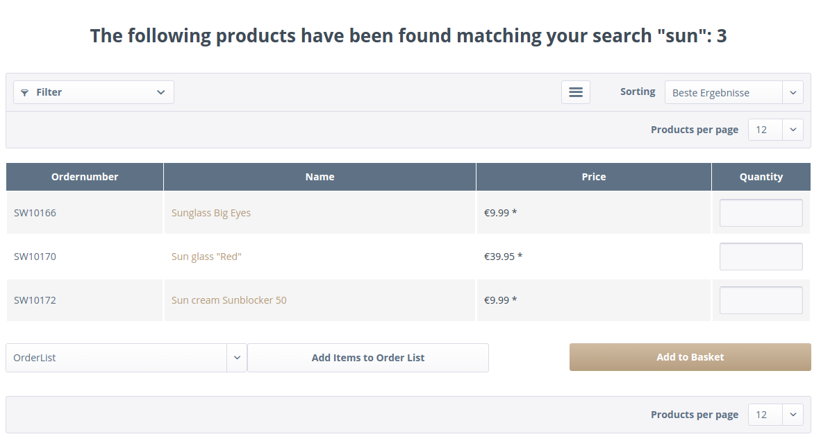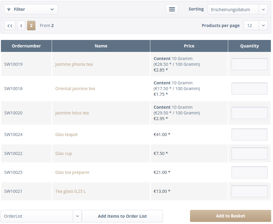 The alternative listing view can be activated with the button in the left of the sorting field. This view is reduced on the basic product information like ordernumber, name, price and quantity you want to buy. So it is possible to add directly one or more products in your cart or to a selected order list.