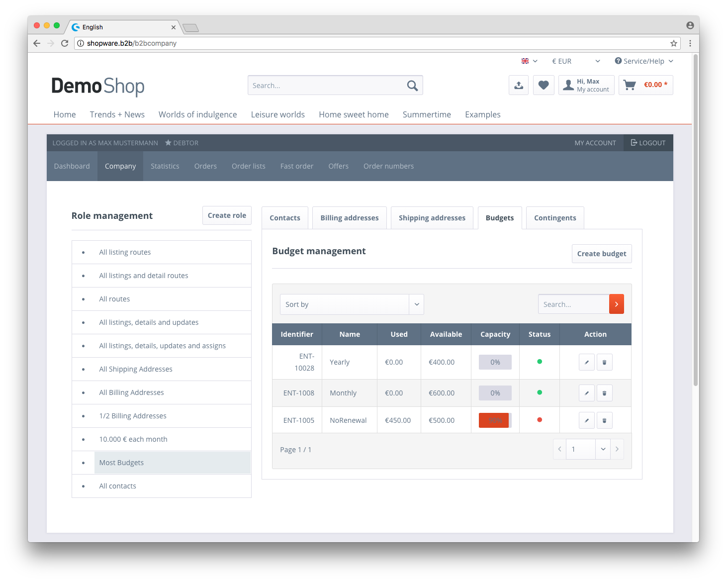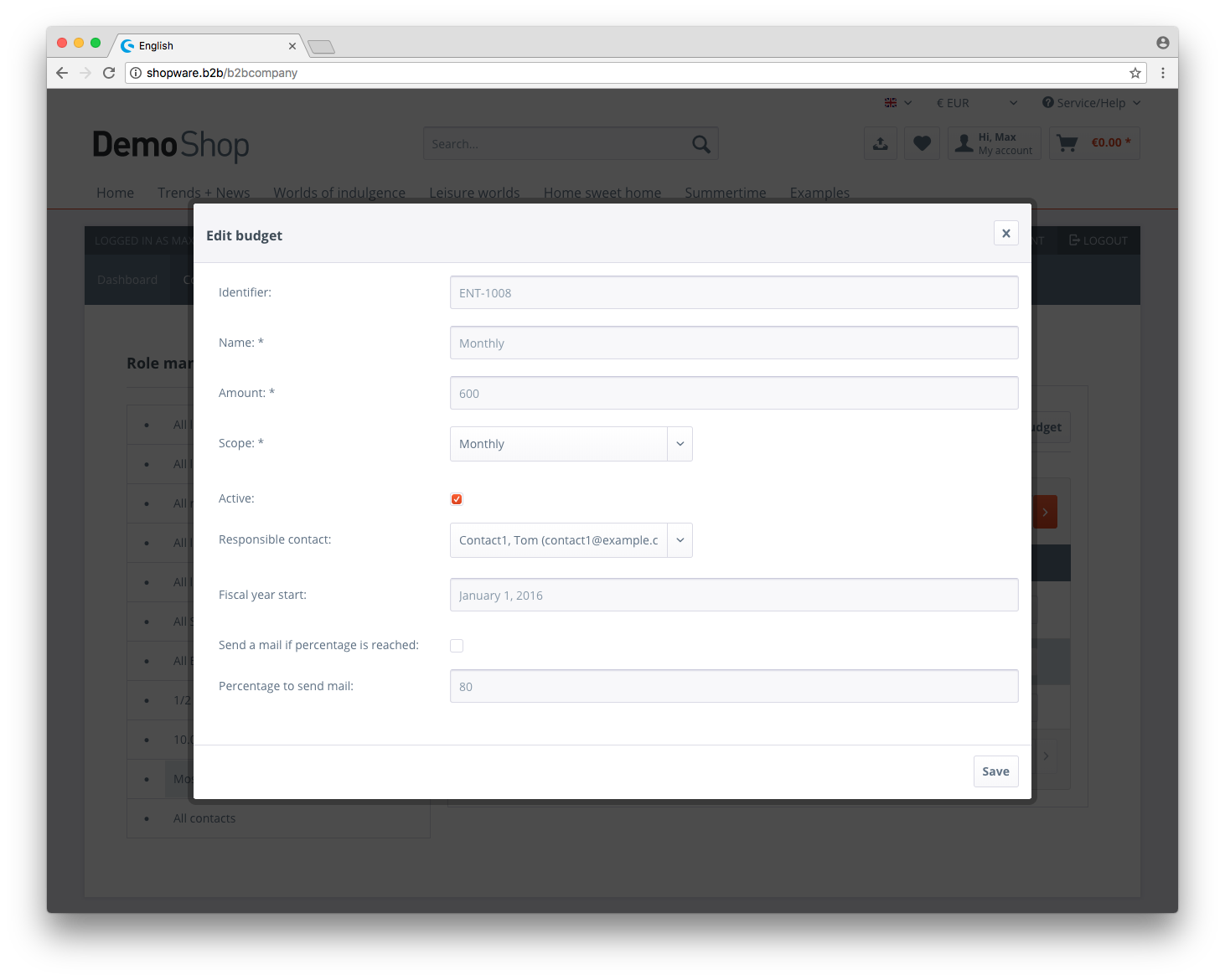 Budgets define the amount of money, which a contact or role can spend. You can set the period and start date of a fiscal year and whether the responsible contact want to get a mail if the defined percentage is reached.