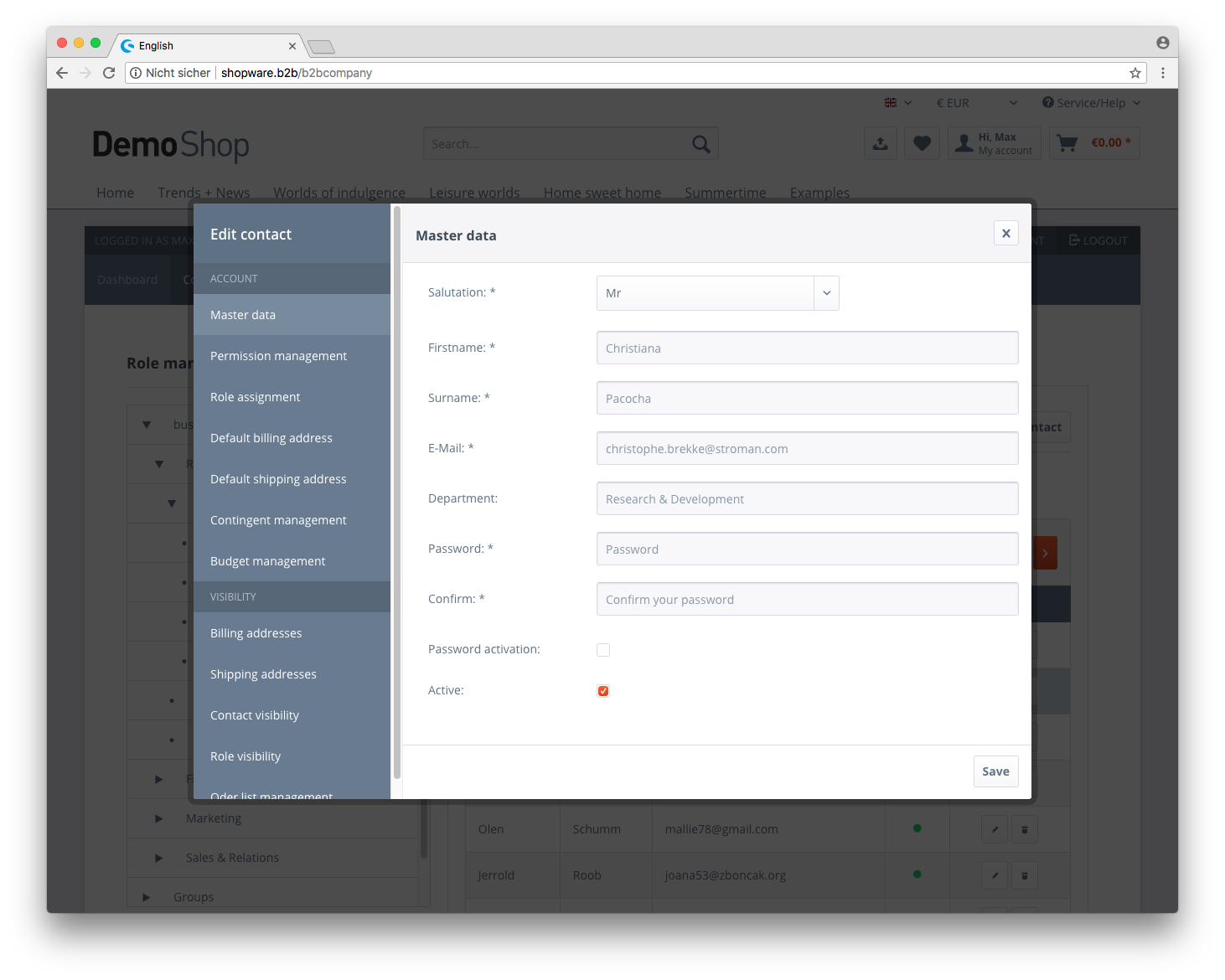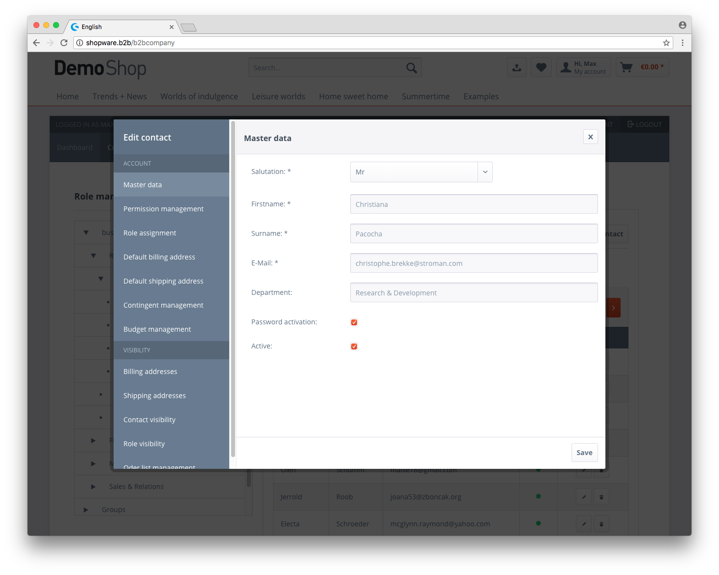 To configure the contact settings you can press somewhere on the contact row. In the detail window you can * Edit master data * Change billing address * Change shipping address * Manage contact visibility * Manage role visibility * Manage roles * Manage permissions * Manage contingents * Manage Order lists * Manage Budgets
