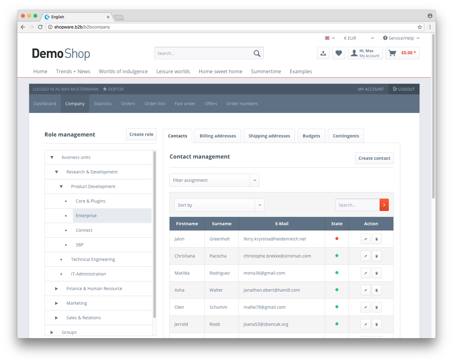 The contact module allows to manage your contacts. Contacts are allowed to login to the shop frontend with their given credentials. Users with permissions can assign roles to the contact which grant or revoke defined permissions. All role permissions can be extended by direct contact permissions, but it is recommended to set the permissions via roles.