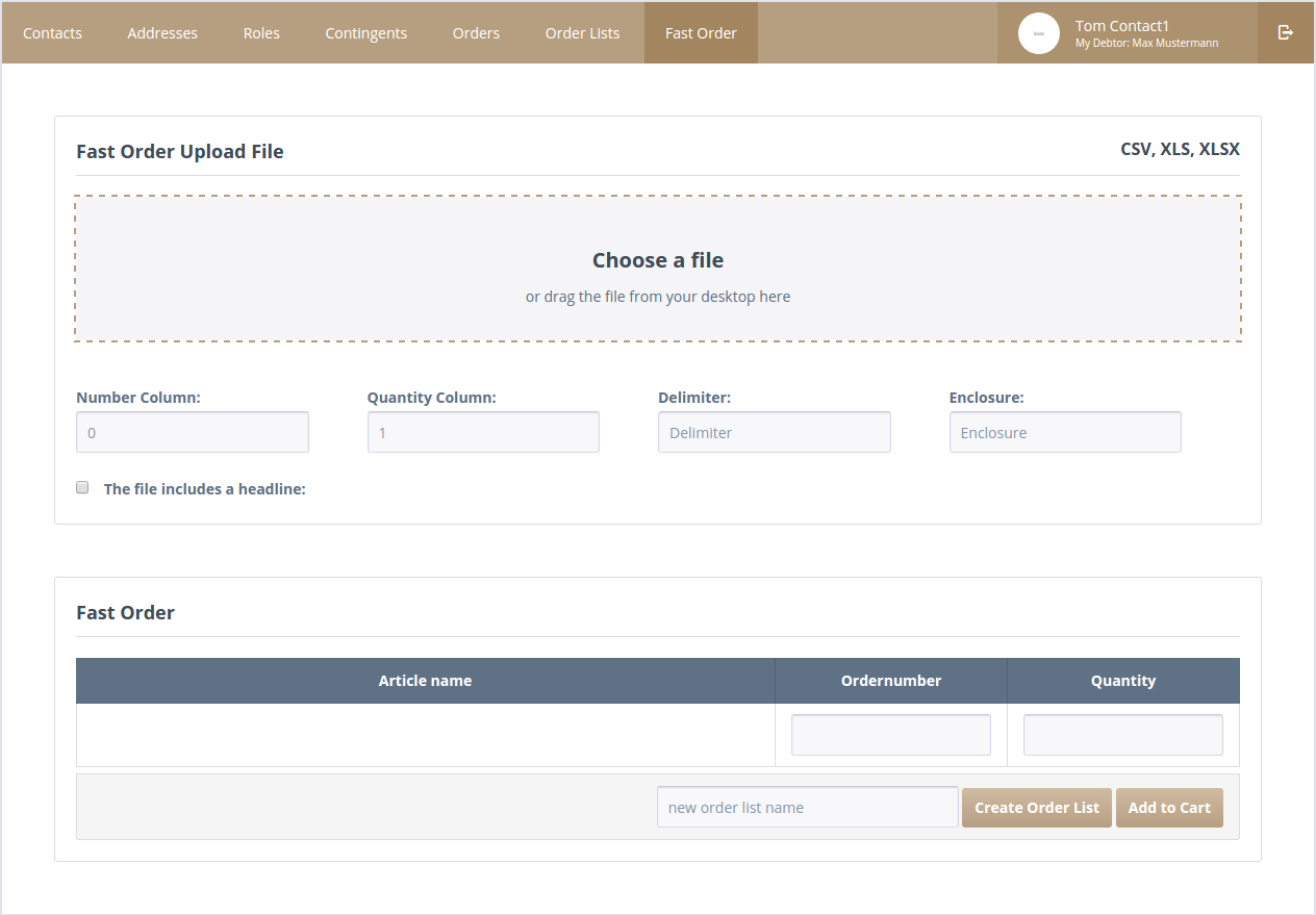 The fast order module allows to create an order or order list from *.csv, *.xls or *.xlsx files.