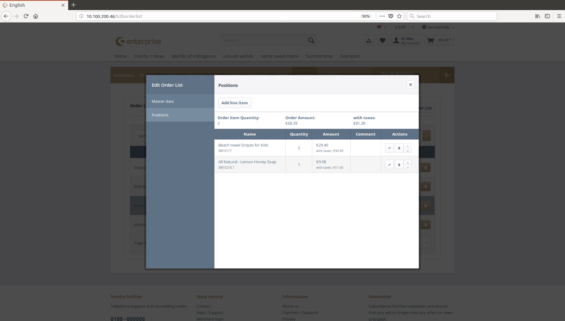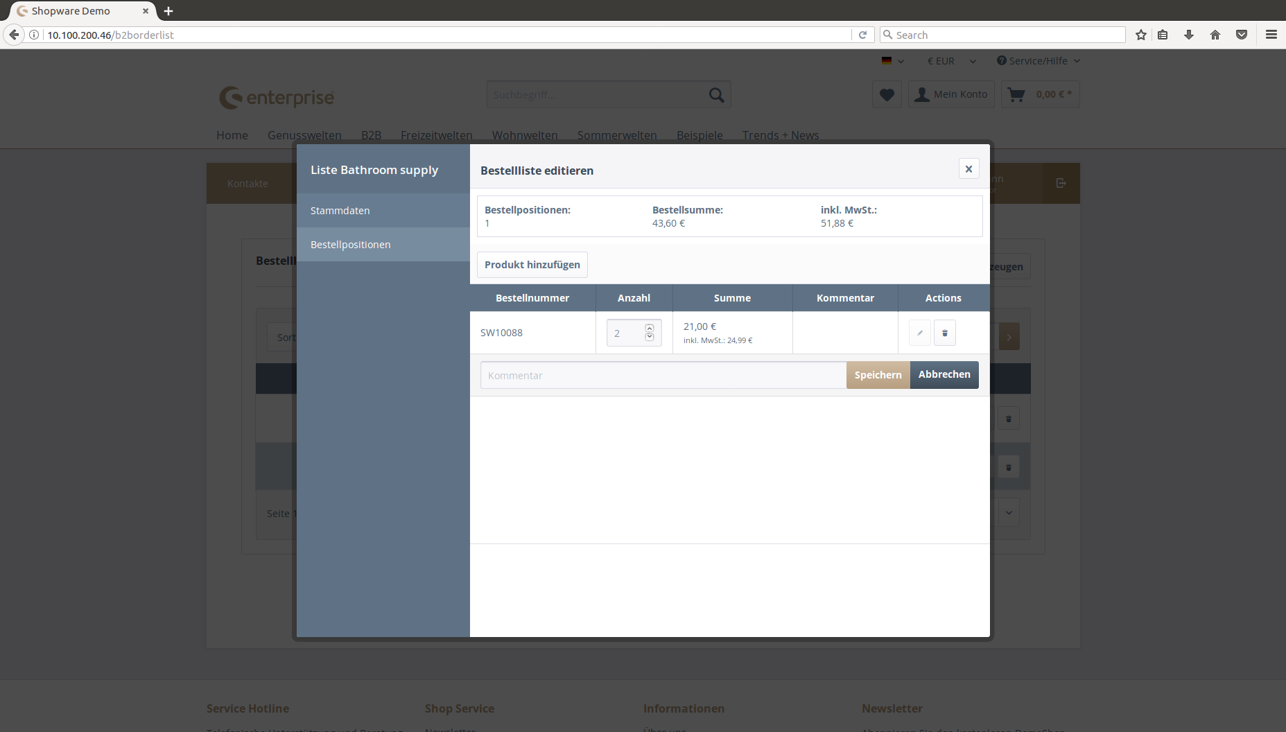 With the arrow buttons, you can sort the order list positions. Deleting is done by clicking the delete button in the row. Through editing, a user can change a position´s quantity and write a comment.