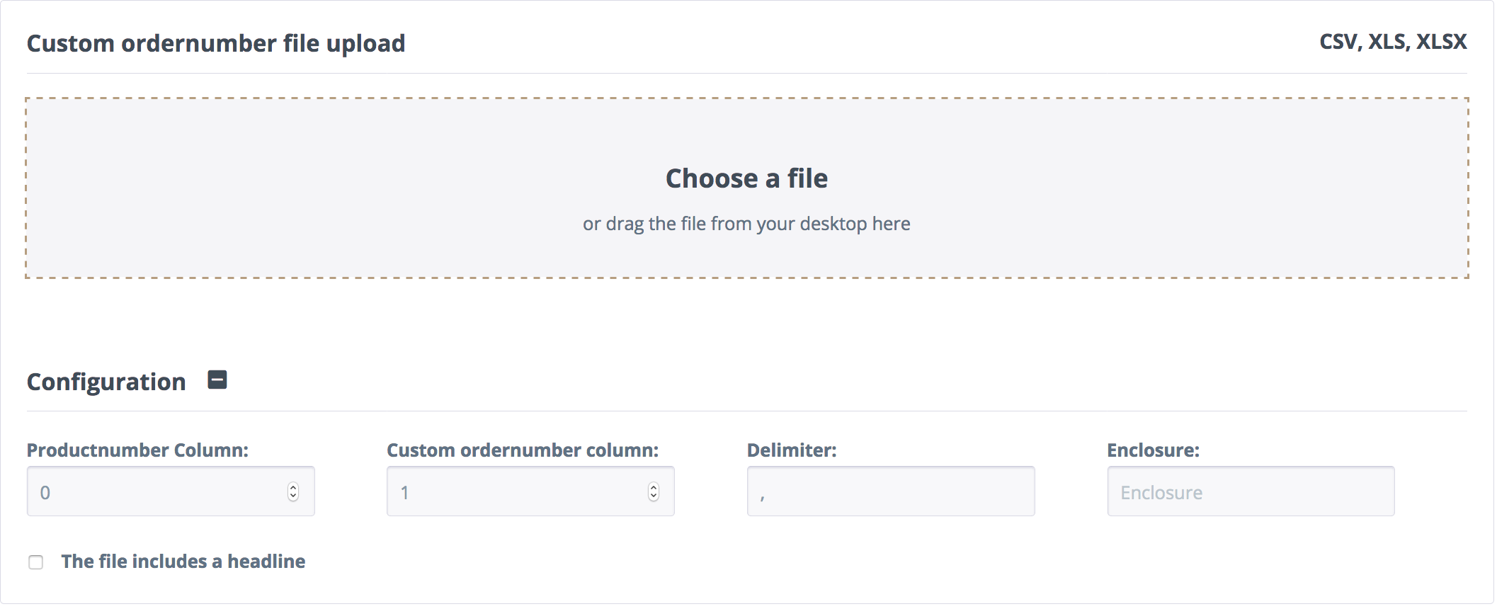 The custom ordernumber upload allows to import ordernumbers from *.csv, *.xls or *.xlsx files