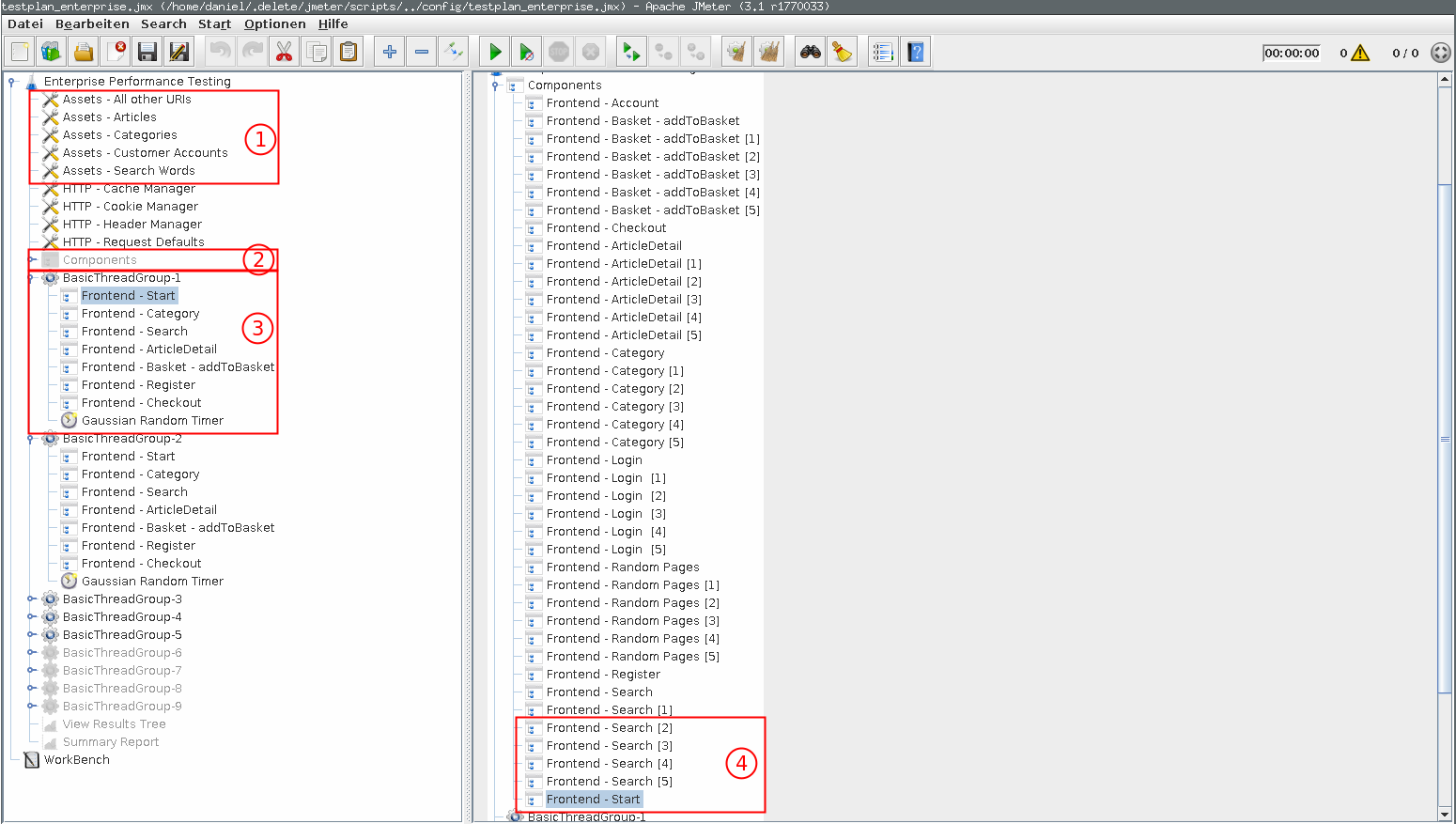 The actual test plans are defined in so called "thread groups": Each thread group copies or links one or more components and therefor "tells a user story" such as "a user visits the start page, searches for 5 items and then adds two items to cart" or "a user browses 3 categories, adds 1 item to cart, registers and performs an order". This way you can try to model real user's behaviour in your test plans. In production, for example, just 3 to 5% of your users will actually perform a checkout. So it makes sense to create one thread group only browsing the shop and one thread group which actually performs checkouts.