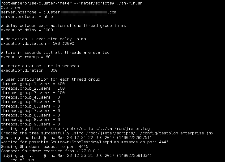 server.hostname: Hostname of the server you want to load test, e.g. my-production-shop.example.comserver.protocol: The protocol you want to use, usually http or httpsexecution.delay: How many ms should pass between each action of a thread groupexecution.deviation: The execution.delay will randomly be increased / reduced by execution.deviationexecution.rampup: JMeter will take up to execution.rampup seconds until all threads are startedexecution.duration: Number of seconds the load test should runthreads.group_NUMER.users: Number of concurrent users you want to simulate for a thread groupThe above configuration, for example, will run for 2 minutes and spawn 100 threads ("users") for the first thread group and 3 threads ("users") for the second thread group. Between each request of a thread ("user") a 10 second delay is defined.